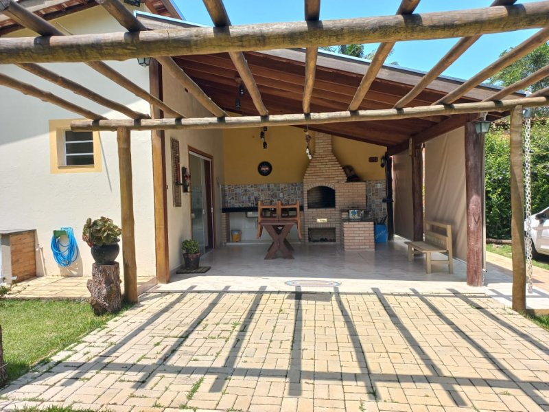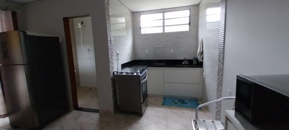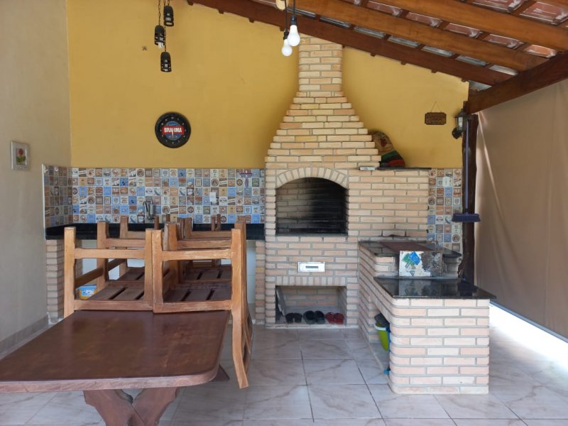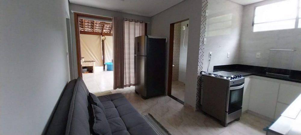 1 dormitório, cozinha, 1 banheiro, churrasqueira, fogão à lenha e forno de pizza.