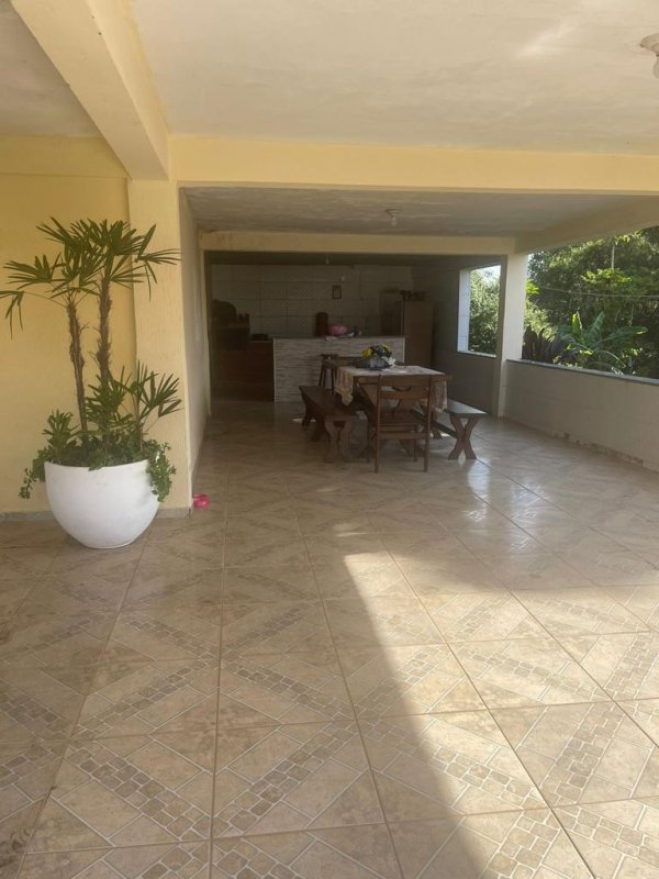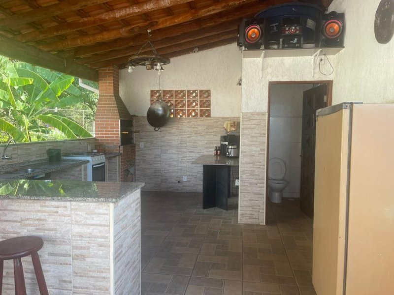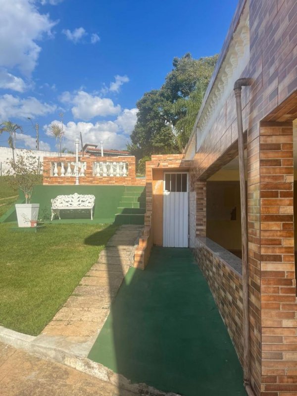 Piscina, dois salões de festa, fogão e forno a lenha, sauna, uma casa de caseiro com 4 comodos, a casa grande com 3 quartos, cozinha, sala de jantar, sala de tv, dois banheiros e lavanderia.
