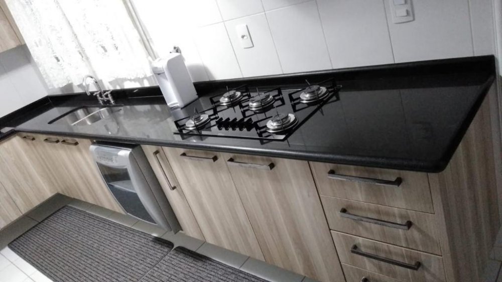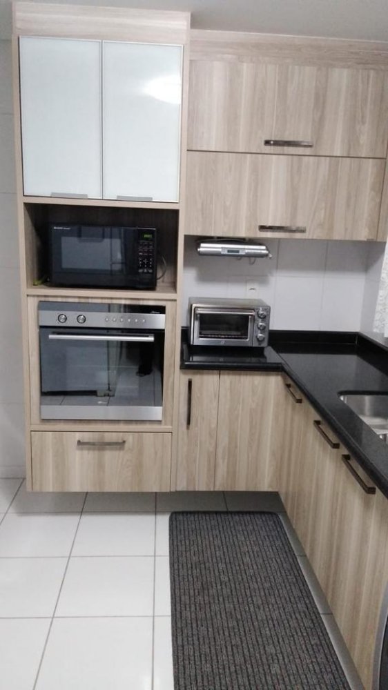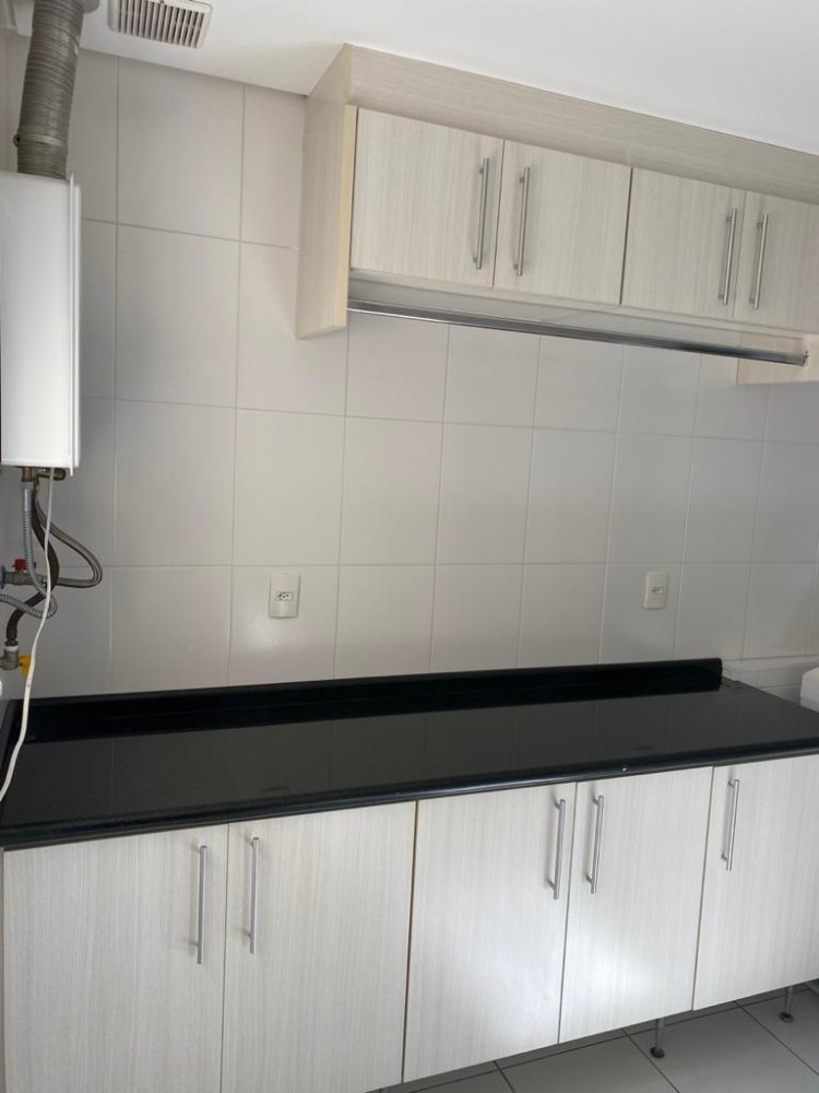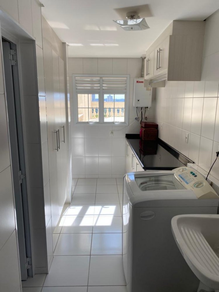 A cozinha é bem equipada e funcional, com armários planejados e fogão cooktop. A área de serviço também é espaçosa e conta com máquina de lavar e secar.