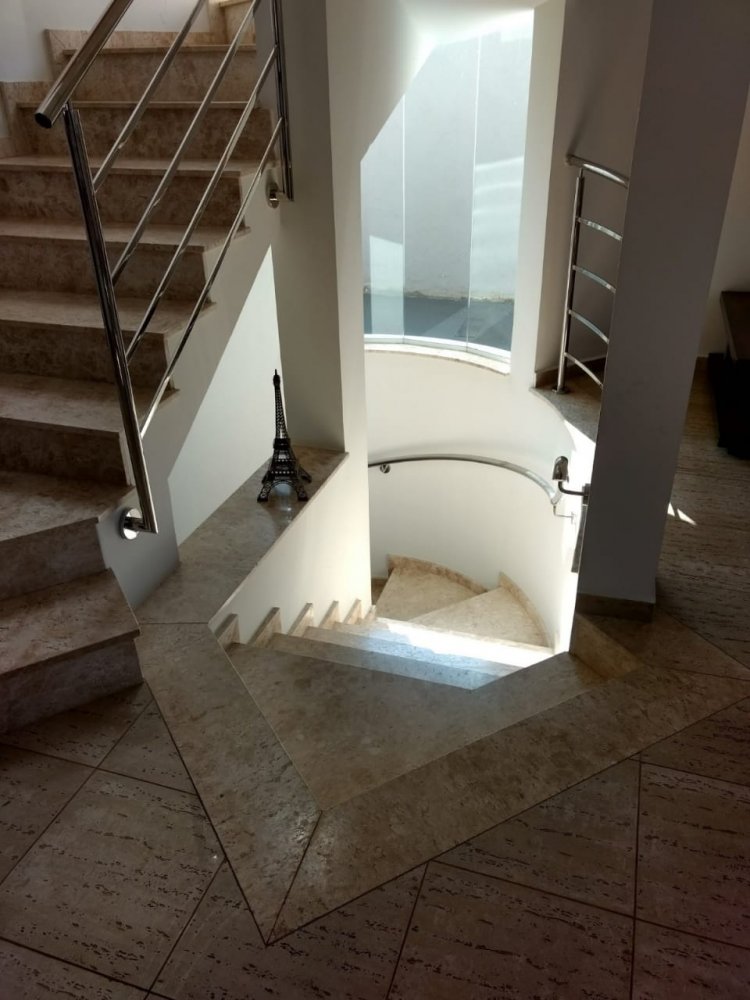 Sala grande c/ pé direito duplo, piso de porcelanato, lareira e escada de mármore de carrara.
