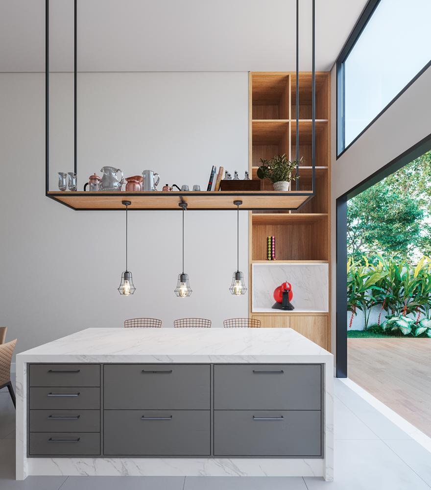 • Cozinha com ilha integrado com área gourmet com churrasqueira equipada com coifa