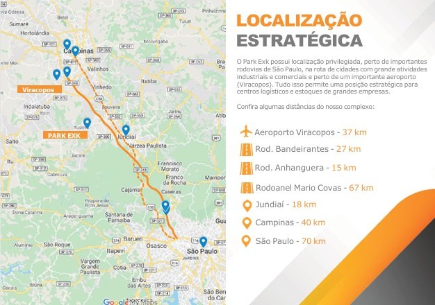 Localização Estratégica, pois o PARK Exk, está localizado próximo de importantes rodovias de São Paulo, na rota de cidades com grandes atividades industriais e comerciais e perto de um importante aeroporto (Viracopos). Tudo isso permite uma posição estratégica para centros logísticos e estoque de grandes empresas.]