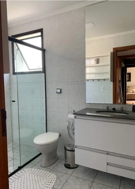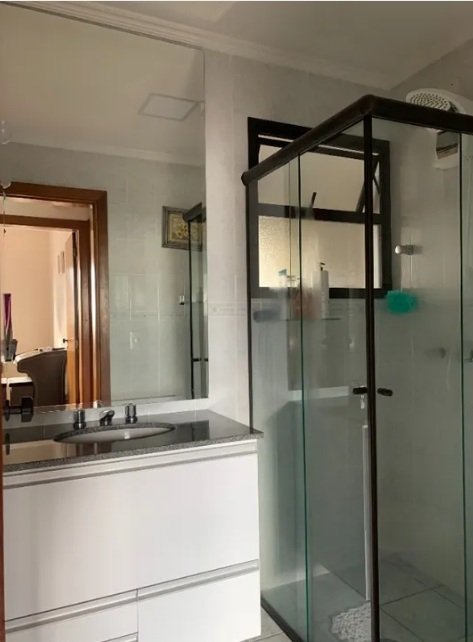 - Banheiros com box de vidro, gabinete e amplo espelho,