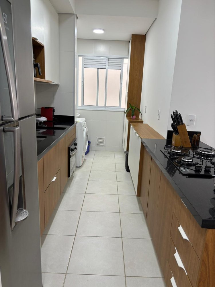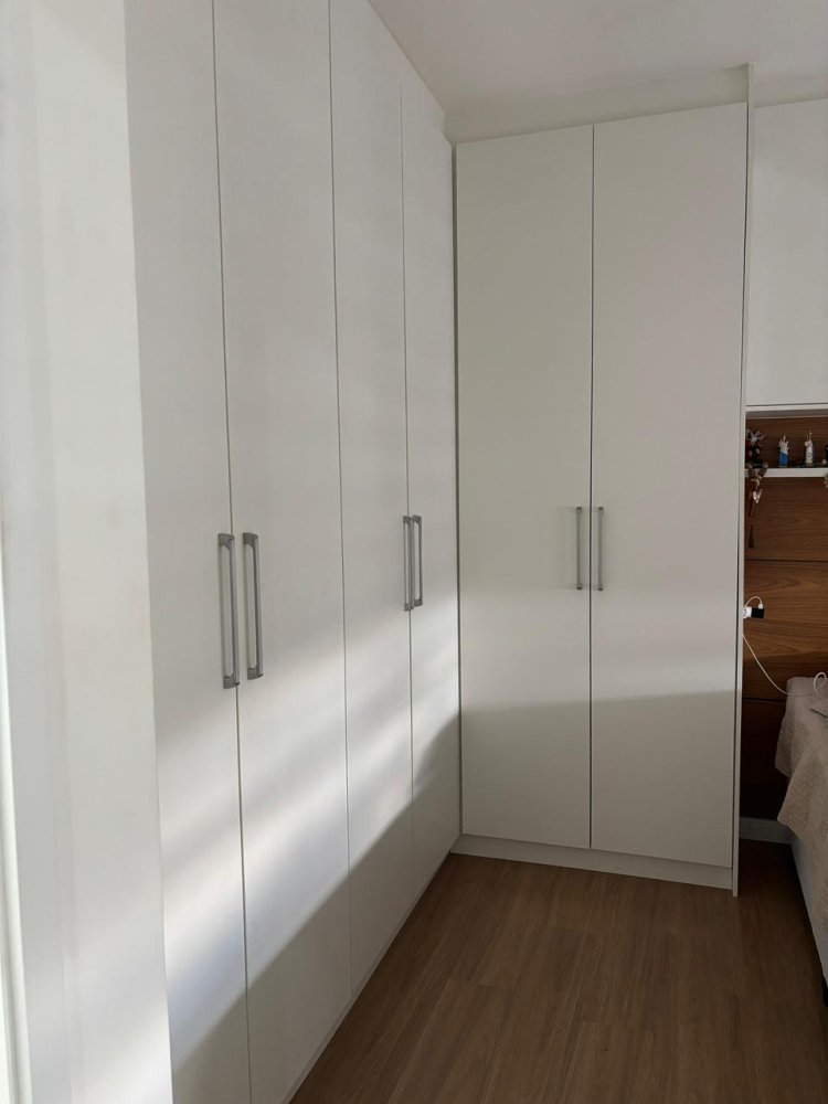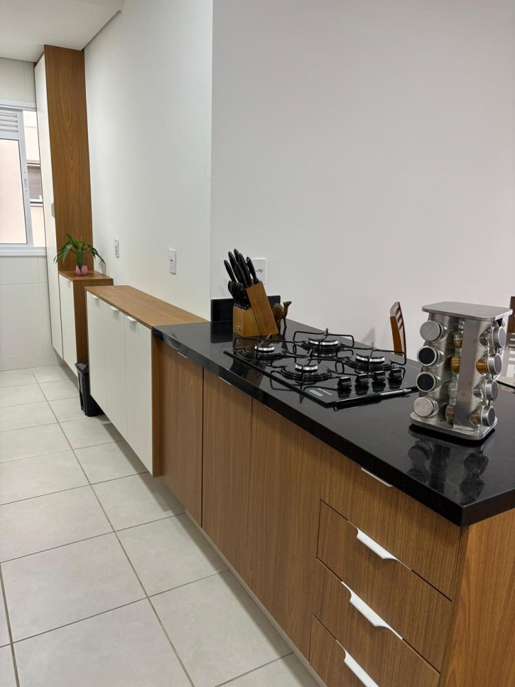 Aquecedor a gás, móveis planejados nos quartos, cozinha e lavanderia.
