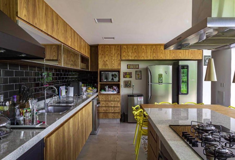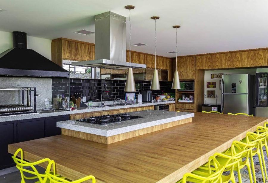 Cozinha planejada completa em conceito aberto com ilha e despensa