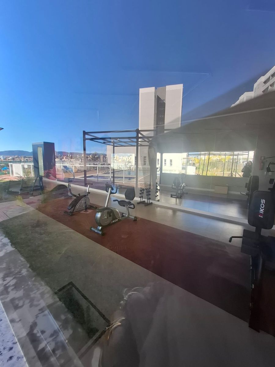 Apartamentos com varanda e área de lazer de clube.
