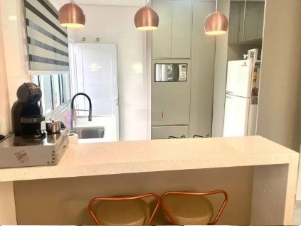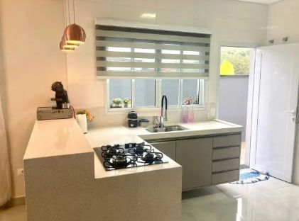 - Cozinha planejada com bancada em granito e quartzo e cooktop;