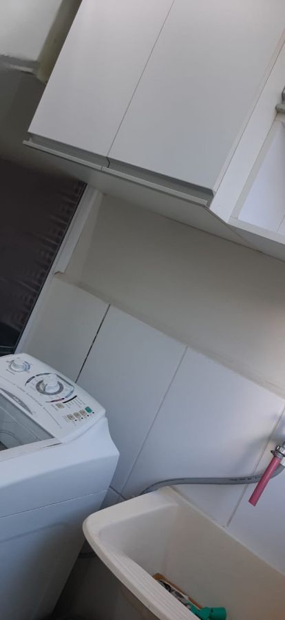 - Lavanderia com maquinda de lavar roupas, armarios e varal